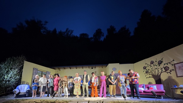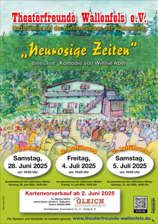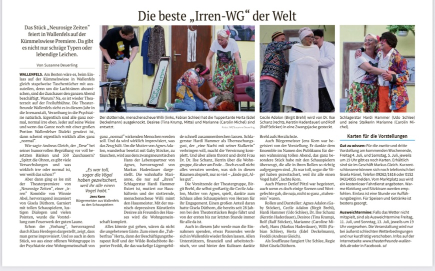 Das Wetter meinte es sehr gut mit uns. An drei milden Sommerabenden präsentierten wir auf der Kümmelswiese unser Stück „Neurosige Zeiten“. Eine große Anzahl von Zuschauern aus nah und fern war der Einladung gefolgt. Die ersten zwei Aufführungen waren ausverkauft. Wir hatten jeweils ein phantastisches Publikum, welches uns mit großem Applaus erfreute.